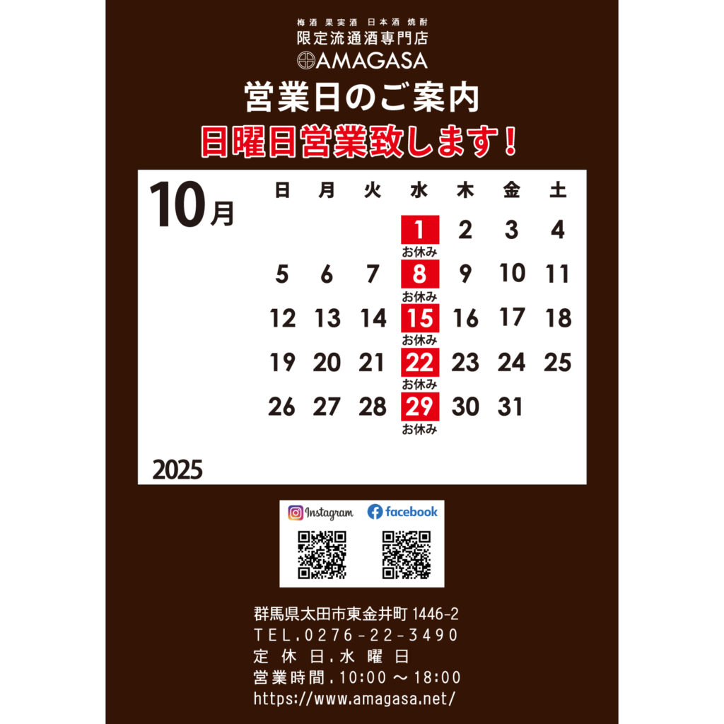 10月の営業日のご案内です。